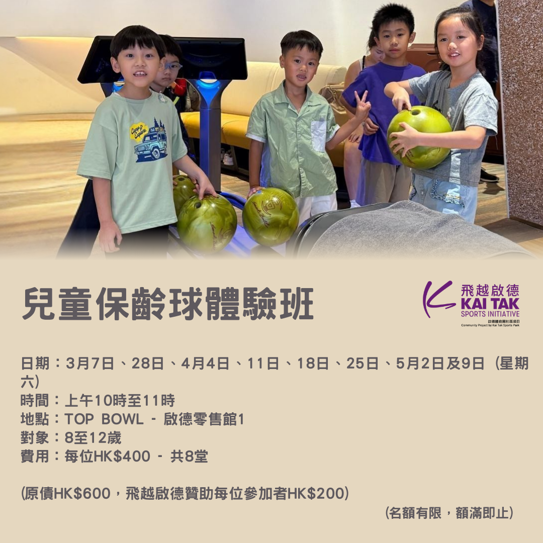 Kai Tak Sports Initiative, in collaboration with Top Bowl, is delighted to launch the Children Bowling Experience Class once again. This program offers children the opportunity to explore the sport of bowling, learn through play as well as to develop a lasting interest in physical activity. In addition to teaching basic bowling techniques, the course helps children strengthen their arm and leg muscles while enhancing their concentration and overall body coordination. The course is open to children aged 8 to 12. Limited spots are available on a first-come, first-served basis – don’t miss out!